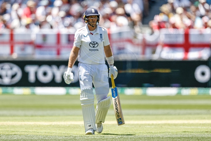 A dejected Joe Root of England leaves the field of play after been dismissed after he's caught out by Marnus Labuschagne of Australia during the NRMA Insurance Ashes First Test Day 1 Series Australia vs England at Optus Stadium, Perth, Australia, 20th November 2025, Credit:Santanu Banik/News Images / Avalon