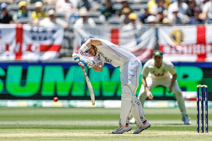 Ollie Pope of England defends his wicket during the NRMA Insurance Ashes First Test Day 1 Series Australia vs England at Optus Stadium, Perth, Australia, 20th November 2025, Credit:Santanu Banik/News Images / Avalon