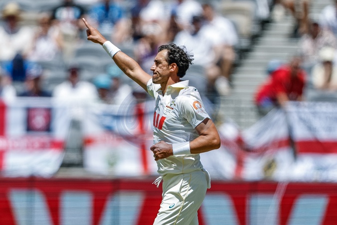 Mitch Starc of Australia celebrates the wicket of England captain Ben Stokes during the NRMA Insurance Ashes First Test Day 1 Series Australia vs England at Optus Stadium, Perth, Australia, 20th November 2025, Credit:Santanu Banik/News Images / Avalon