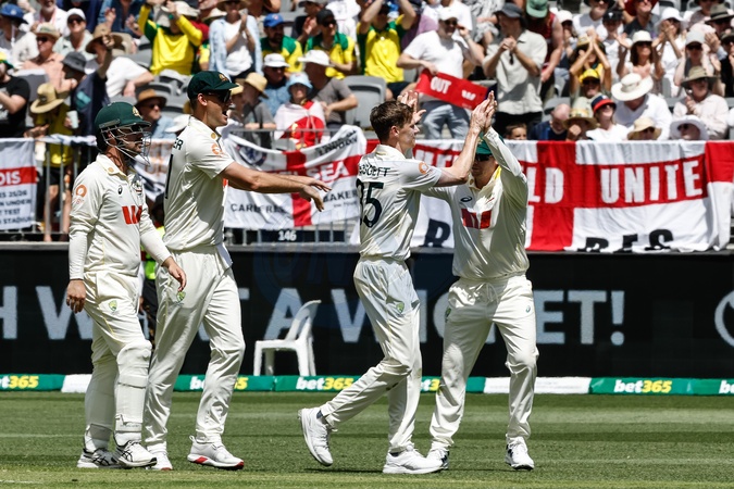 Brendan Doggett of Australia celebrates the wicket of Brydon Carse of England during the NRMA Insurance Ashes First Test Day 1 Series Australia vs England at Optus Stadium, Perth, Australia, 20th November 2025, Credit:Santanu Banik/News Images / Avalon