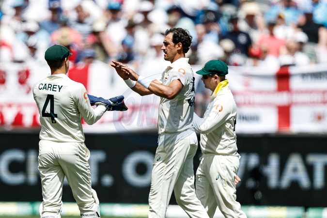 Mitch Starc of Australia celebrates his seventh wicket during the NRMA Insurance Ashes First Test Day 1 Series Australia vs England at Optus Stadium, Perth, Australia, 20th November 2025, Credit:Santanu Banik/News Images / Avalon