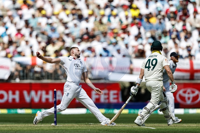 Gus Atkinson of England delivers the ball during the NRMA Insurance Ashes First Test Day 1 Series Australia vs England at Optus Stadium, Perth, Australia, 20th November 2025, Credit:Santanu Banik/News Images / Avalon