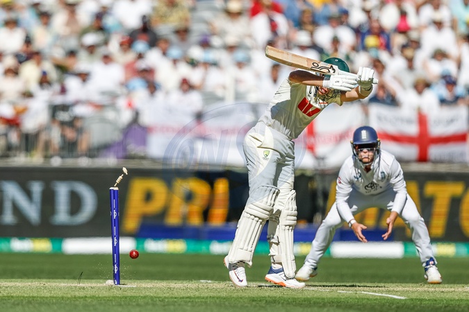 Marnus Labuschagne of Australia is bowled out by Jofra Archer of England during the NRMA Insurance Ashes First Test Day 1 Series Australia vs England at Optus Stadium, Perth, Australia, 20th November 2025, Credit:Santanu Banik/News Images / Avalon