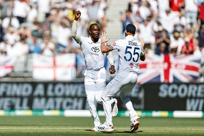 Jofra Archer of England celebrates blowing out Marnus Labuschagne of Australia with England captain Ben Stokes during the NRMA Insurance Ashes First Test Day 1 Series Australia vs England at Optus Stadium, Perth, Australia, 20th November 2025, Credit:Santanu Banik/News Images / Avalon