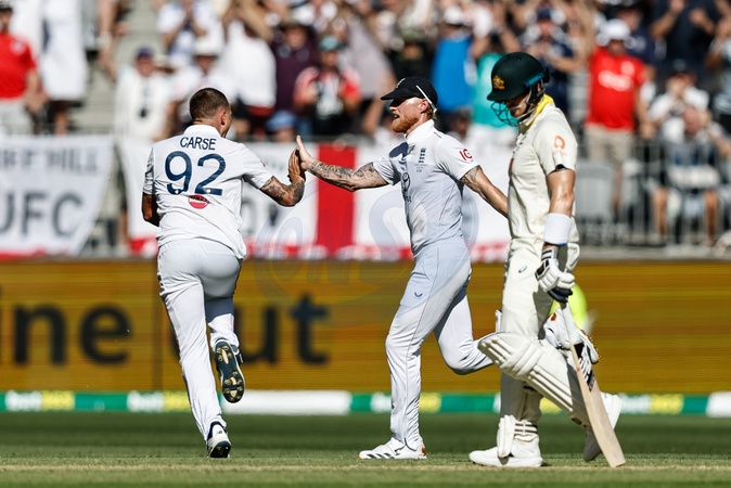 Brydon Carse of England celebrates the wicket of Australia captain Steve Smith during the NRMA Insurance Ashes First Test Day 1 Series Australia vs England at Optus Stadium, Perth, Australia, 20th November 2025, Credit:Santanu Banik/News Images / Avalon
