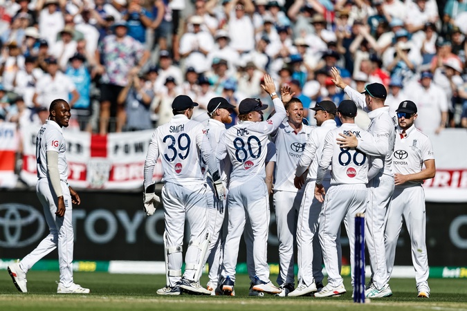 Brydon Carse of England celebrates the wicket of Australia captain Steve Smith during the NRMA Insurance Ashes First Test Day 1 Series Australia vs England at Optus Stadium, Perth, Australia, 20th November 2025, Credit:Santanu Banik/News Images / Avalon