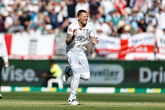 Brydon Carse of England celebrates the wicket of Usman Khawaja of Australia during the NRMA Insurance Ashes First Test Day 1 Series Australia vs England at Optus Stadium, Perth, Australia, 20th November 2025, Credit:Santanu Banik/News Images / Avalon