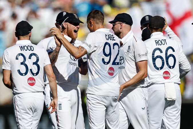 Brydon Carse celebrates the wicket of Usman Khawaja of Australia with England captain Ben Stokes during the NRMA Insurance Ashes First Test Day 1 Series Australia vs England at Optus Stadium, Perth, Australia, 20th November 2025, Credit:Santanu Banik/News Images / Avalon