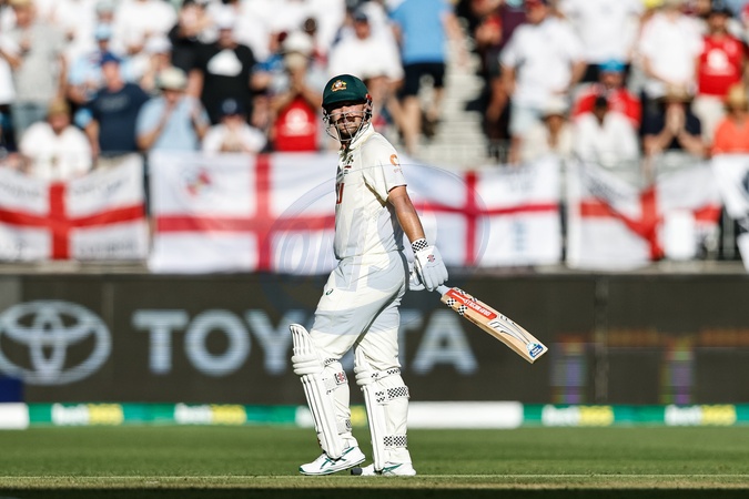 A dejected Travis Head of Australia leaves the field of play after been dismissed during the NRMA Insurance Ashes First Test Day 1 Series Australia vs England at Optus Stadium, Perth, Australia, 20th November 2025, Credit:Santanu Banik/News Images / Avalon