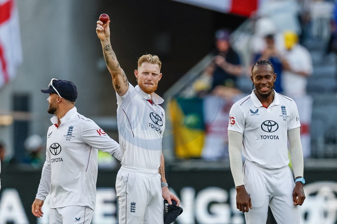 England captain Ben Stokes celebrates his 5th wicket of the session during the NRMA Insurance Ashes First Test Day 1 Series Australia vs England at Optus Stadium, Perth, Australia, 20th November 2025, Credit:Santanu Banik/News Images / Avalon