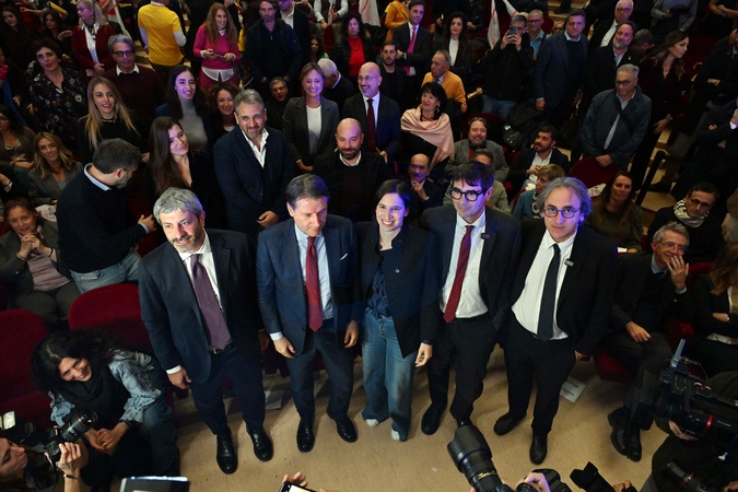 November 20, 2025: The center-left's election campaign ends to support Campania regional candidate Roberto Fico. Pictured: Roberto Fico, Giuseppe Conte, Elly Schlein, Nicola Fratoianni, and Angelo Bonelli., Credit:/AGF / Avalon