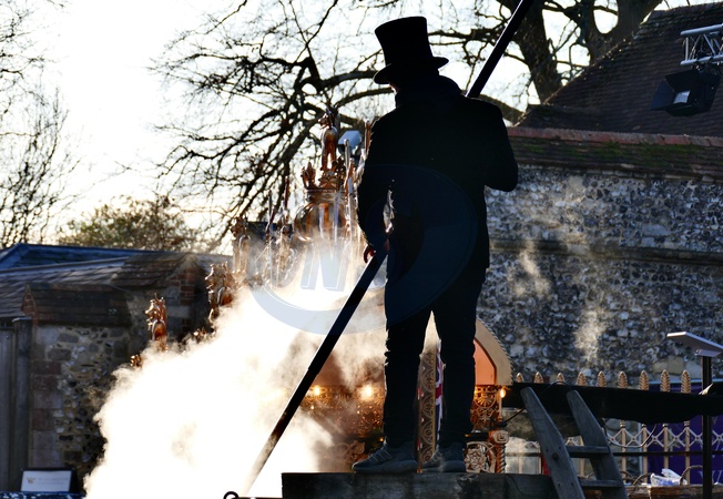 The Winchester Christmas market opened today. A mulled wine stirrer wearing a top hat stood high up on a platform to prepare the mulled wine to sell to visitors to the popular event in the grounds of Winchester Cathedral., Credit:Geoffrey Swaine / Avalon