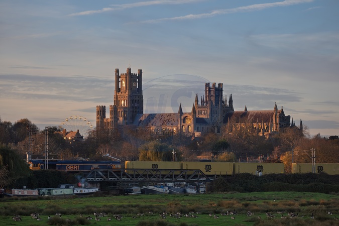 Ely Cathedral and sunset, with a large viewing wheel erected for the pre Christmas period. With GBRF goods train and containers approaching Ely train station. Ely, Cambridgeshire, UK.