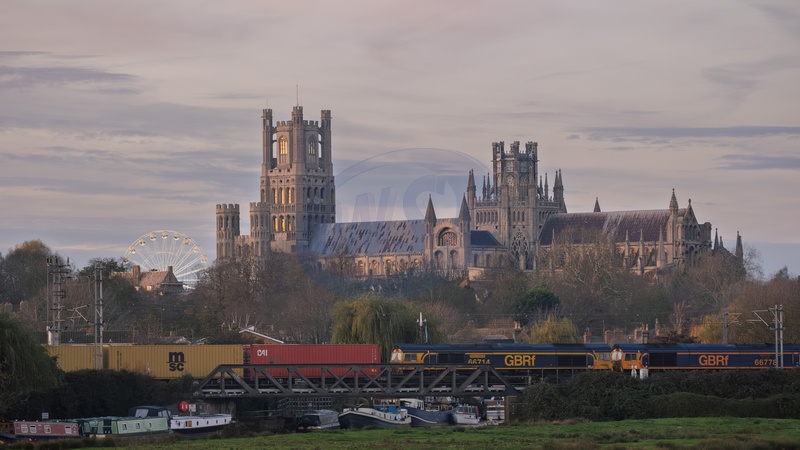 Ely Cathedral and sunset, with a large viewing wheel erected for the pre Christmas period. GBRF freight train and containers approaching Ely train station on route to Felixstowe port. Ely, Cambridgeshire, UK.
