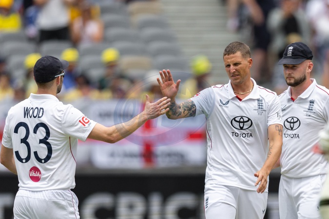 Brydon Carse of England is congratulated by his team mates after taking a wicket during the NRMA Insurance Ashes First Test Day 2 Australia vs England at Optus Stadium, Perth, Australia, 22nd November 2025, Credit:Santanu Banik/News Images / Avalon
