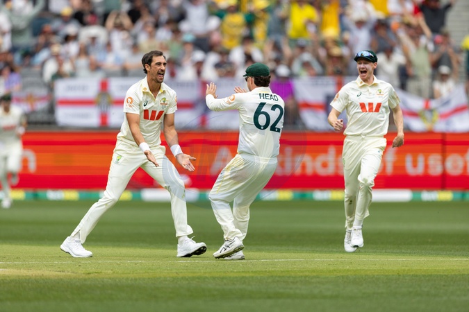 Mitch Starc of Australia is congratulated by his team mates after taking a wicket during the NRMA Insurance Ashes First Test Day 2 Australia vs England at Optus Stadium, Perth, Australia, 22nd November 2025, Credit:Santanu Banik/News Images / Avalon