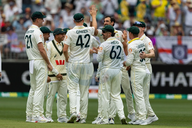 Mitch Starc of Australia is congratulated by his team mates after taking a wicket during the NRMA Insurance Ashes First Test Day 2 Australia vs England at Optus Stadium, Perth, Australia, 22nd November 2025, Credit:Santanu Banik/News Images / Avalon