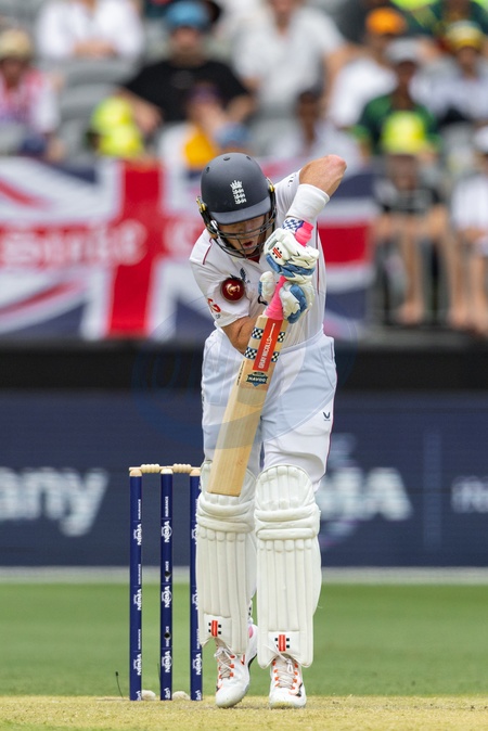 Ollie Pope of England is hit on the body by the ball during the NRMA Insurance Ashes First Test Day 2 Australia vs England at Optus Stadium, Perth, Australia, 22nd November 2025, Credit:Santanu Banik/News Images / Avalon