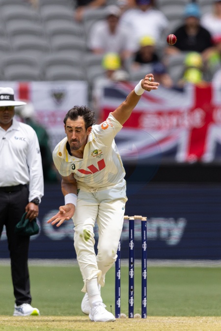 Mitch Starc of Australia bowls during the NRMA Insurance Ashes First Test Day 2 Australia vs England at Optus Stadium, Perth, Australia, 22nd November 2025, Credit:Santanu Banik/News Images / Avalon