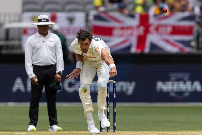 Mitch Starc of Australia bowls during the NRMA Insurance Ashes First Test Day 2 Australia vs England at Optus Stadium, Perth, Australia, 22nd November 2025, Credit:Santanu Banik/News Images / Avalon