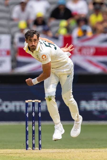 Mitch Starc of Australia bowls during the NRMA Insurance Ashes First Test Day 2 Australia vs England at Optus Stadium, Perth, Australia, 22nd November 2025, Credit:Santanu Banik/News Images / Avalon
