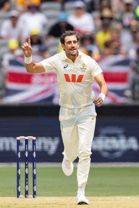 Mitch Starc of Australia celebrates after taking a wicket during the NRMA Insurance Ashes First Test Day 2 Australia vs England at Optus Stadium, Perth, Australia, 22nd November 2025, Credit:Santanu Banik/News Images / Avalon