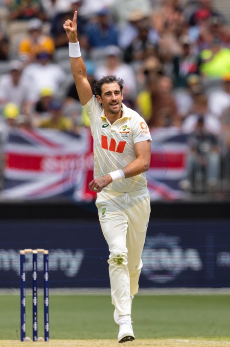Mitch Starc of Australia celebrates after taking a wicket during the NRMA Insurance Ashes First Test Day 2 Australia vs England at Optus Stadium, Perth, Australia, 22nd November 2025, Credit:Santanu Banik/News Images / Avalon
