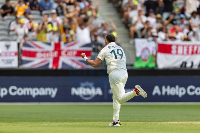 Scott Boland of Australia celebrates after taking a wicket during the NRMA Insurance Ashes First Test Day 2 Australia vs England at Optus Stadium, Perth, Australia, 22nd November 2025, Credit:Santanu Banik/News Images / Avalon