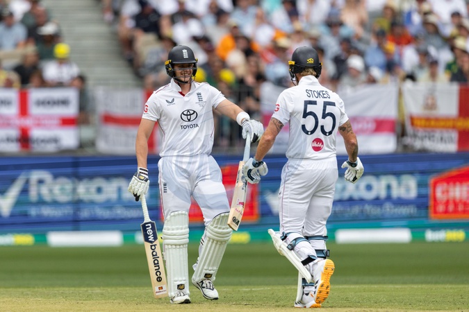 Jamie Smith is giving back the bat to Ben Stokes (c) of England during the NRMA Insurance Ashes First Test Day 2 Australia vs England at Optus Stadium, Perth, Australia, 22nd November 2025, Credit:Santanu Banik/News Images / Avalon