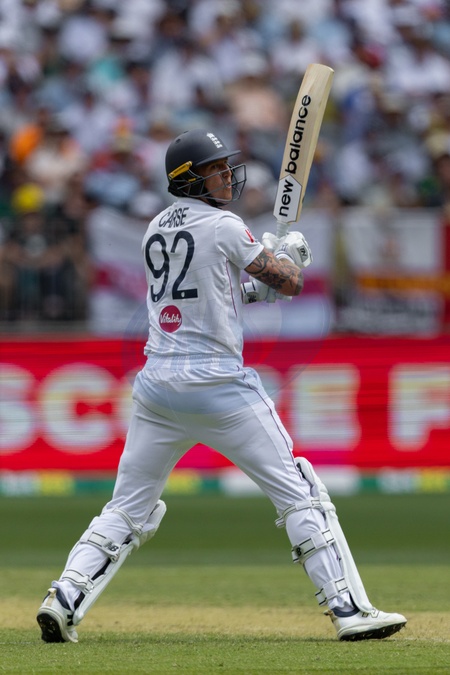 Brydon Carse of England plays a lofted shot during the NRMA Insurance Ashes First Test Day 2 Australia vs England at Optus Stadium, Perth, Australia, 22nd November 2025, Credit:Santanu Banik/News Images / Avalon