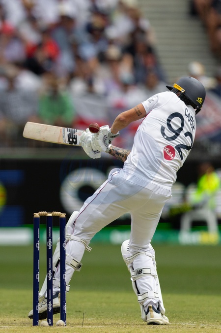Brydon Carse of England gets out caught during the NRMA Insurance Ashes First Test Day 2 Australia vs England at Optus Stadium, Perth, Australia, 22nd November 2025, Credit:Santanu Banik/News Images / Avalon