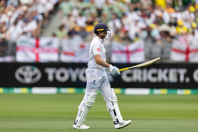 Joe Root of England walks off after getting out during the NRMA Insurance Ashes First Test Day 2 Australia vs England at Optus Stadium, Perth, Australia, 22nd November 2025, Credit:Santanu Banik/News Images / Avalon