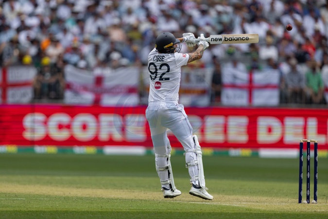 Brydon Carse of England in action during the NRMA Insurance Ashes First Test Day 2 Australia vs England at Optus Stadium, Perth, Australia, 22nd November 2025, Credit:Santanu Banik/News Images / Avalon