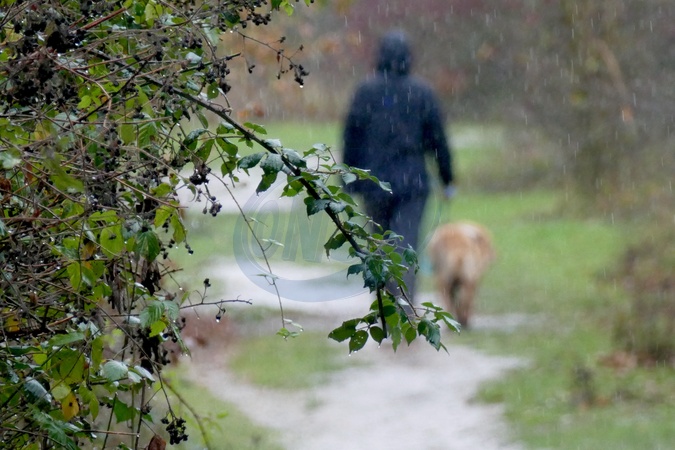 People out on a dull morning during the heavy rainfall., Credit:Geoffrey Swaine / Avalon