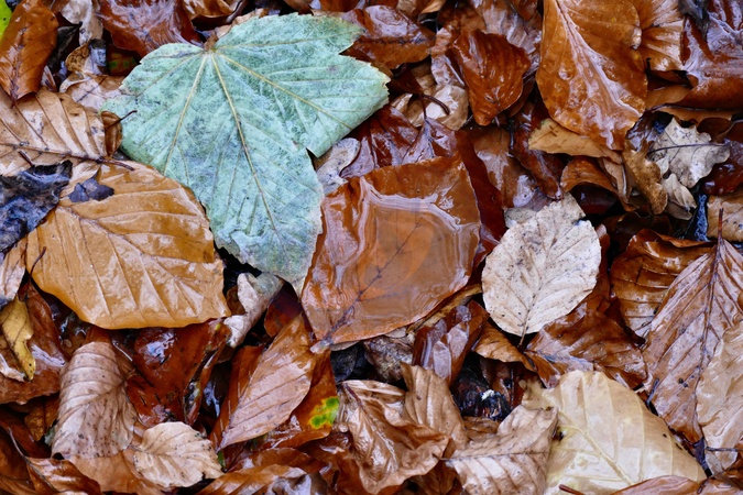 A carpet of sodden copper beech leaves on the copse floor during the heavy rain., Credit:Geoffrey Swaine / Avalon