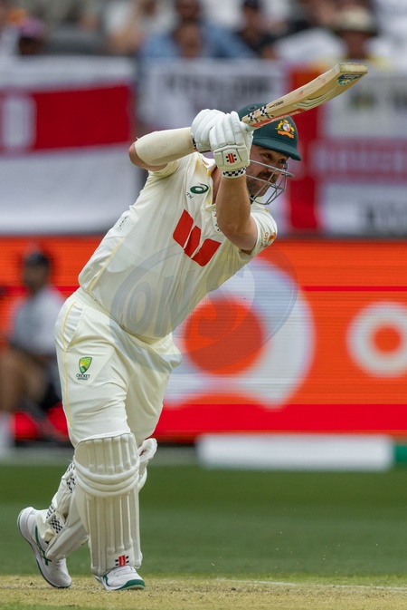 Travis Head of Australia drives the ball during the NRMA Insurance Ashes First Test Day 2 Australia vs England at Optus Stadium, Perth, Australia, 22nd November 2025, Credit:Santanu Banik/News Images / Avalon