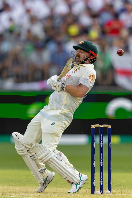 Travis Head of Australia plays and misses a ball during the NRMA Insurance Ashes First Test Day 2 Australia vs England at Optus Stadium, Perth, Australia, 22nd November 2025, Credit:Santanu Banik/News Images / Avalon