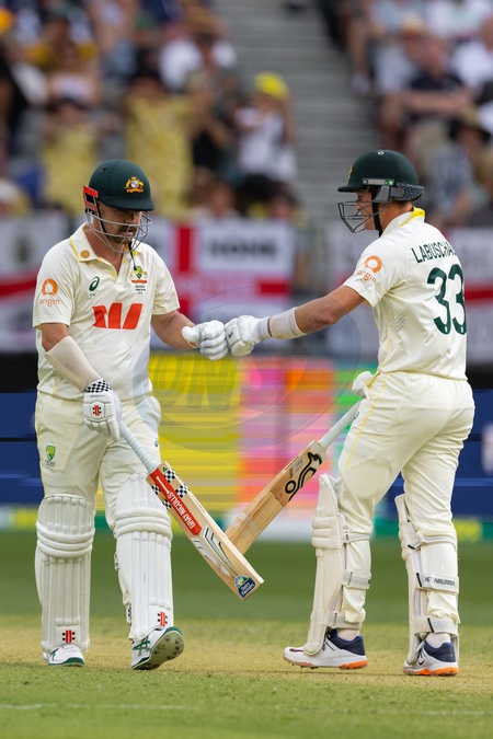 Travis Head and Marnus Labuschagne of Australia are seen bumping gloves during the NRMA Insurance Ashes First Test Day 2 Australia vs England at Optus Stadium, Perth, Australia, 22nd November 2025, Credit:Santanu Banik/News Images / Avalon