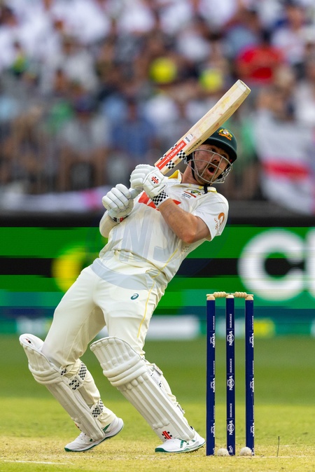 Travis Head of Australia plays and misses a ball during the NRMA Insurance Ashes First Test Day 2 Australia vs England at Optus Stadium, Perth, Australia, 22nd November 2025, Credit:Santanu Banik/News Images / Avalon