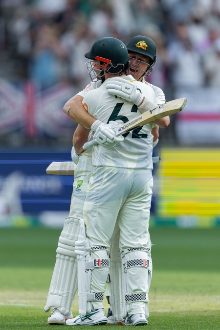 Travis Head of Australia is congratulated by his teammate after scoring a century during the NRMA Insurance Ashes First Test Day 2 Australia vs England at Optus Stadium, Perth, Australia, 22nd November 2025, Credit:Santanu Banik/News Images / Avalon