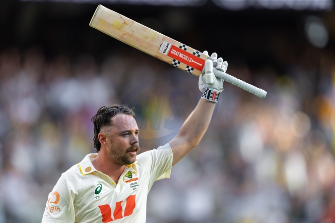 Travis Head of Australia cheers the crowd during the NRMA Insurance Ashes First Test Day 2 Australia vs England at Optus Stadium, Perth, Australia, 22nd November 2025, Credit:Santanu Banik/News Images / Avalon