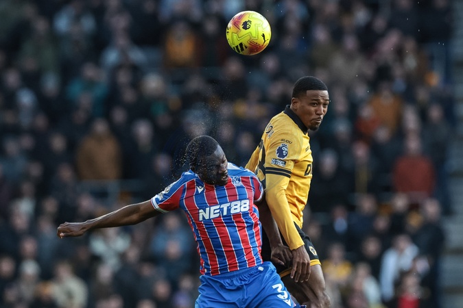 Tyrick Mitchell of Crystal Palace and Jackson Tchatchoua of Wolverhampton Wanderers battle for the ball during the Premier League match Wolverhampton Wanderers vs Crystal Palace at Molineux, Wolverhampton, United Kingdom, 22nd November 2025, Credit:Mark Cosgrove/News Images / Avalon