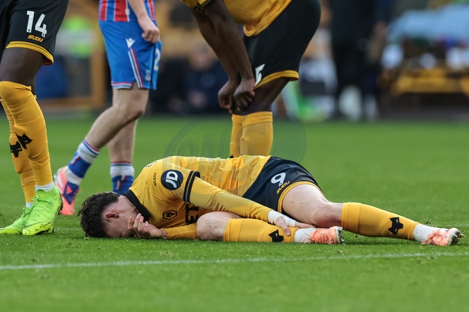 Jorgen Strand Larsen of Wolverhampton Wanderers injured after being fouled during the Premier League match Wolverhampton Wanderers vs Crystal Palace at Molineux, Wolverhampton, United Kingdom, 22nd November 2025, Credit:Mark Cosgrove/News Images / Avalon