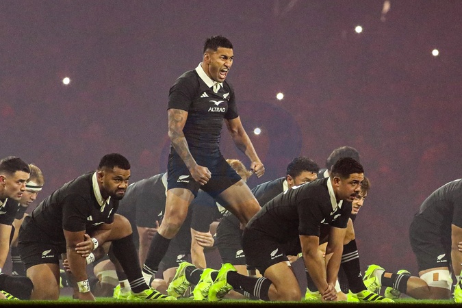 Rieko Ioane of New Zealand leads the Haka during the Quilter Nations Series 2025 match Wales vs New Zealand at Principality Stadium, Cardiff, United Kingdom, 22nd November 2025, Credit:Andrew Lewis/News Images / Avalon