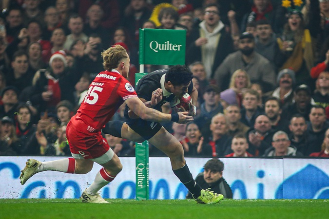 Caleb Clarke of New Zealand sores his teams first try during the Quilter Nations Series 2025 match Wales vs New Zealand at Principality Stadium, Cardiff, United Kingdom, 22nd November 2025, Credit:Andrew Lewis/News Images / Avalon
