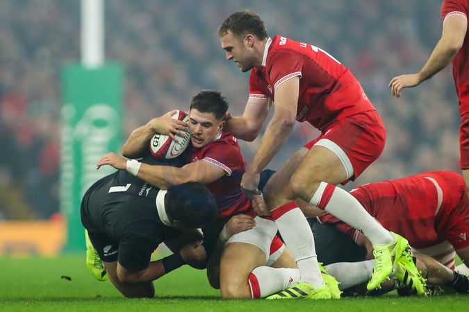Joe Hawkins of Wales is tackled during the Quilter Nations Series 2025 match Wales vs New Zealand at Principality Stadium, Cardiff, United Kingdom, 22nd November 2025, Credit:Andrew Lewis/News Images / Avalon