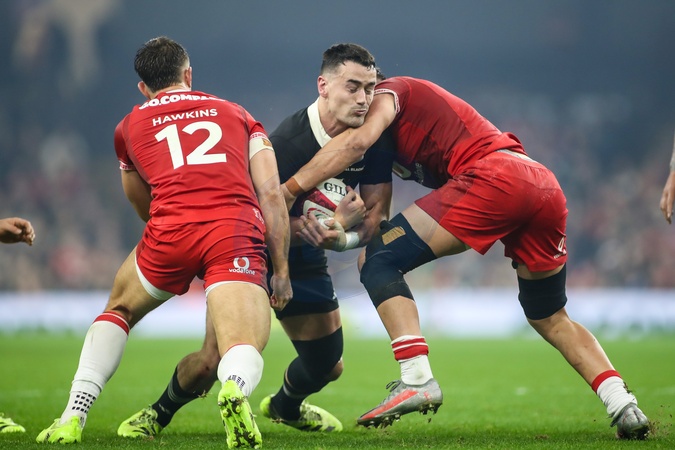 Will Jordan of New Zealand is tackled during the Quilter Nations Series 2025 match Wales vs New Zealand at Principality Stadium, Cardiff, United Kingdom, 22nd November 2025, Credit:Andrew Lewis/News Images / Avalon