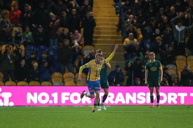 Will Evans of Mansfield Town celebrates his goal to make it 1-3 during the Sky Bet League 1 match Mansfield Town vs Huddersfield Town at One Call Stadium, Mansfield, United Kingdom, 22nd November 2025, Credit:Richard Bierton/News Images / Avalon