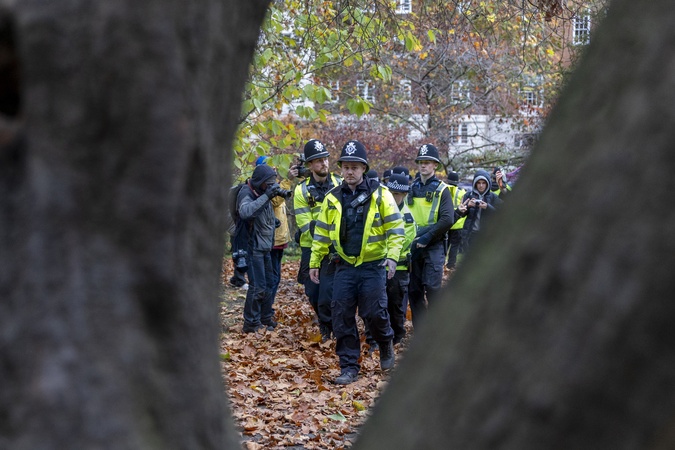 The Peace Garden, Tavistock Square, WC1H 9BQ — Saturday 22nd November 2025. Protesters gathered for the second London "Lift the Ban” event, opposing the government's ban on direct-action group Palestine Action. The demonstration formed part of the wider "Defend Our Juries” campaign. Police maintained a strong presence throughout the protest, during which approximately 100 people were arrested for terrorism offences., Credit:Abdullah Bailey / Avalon