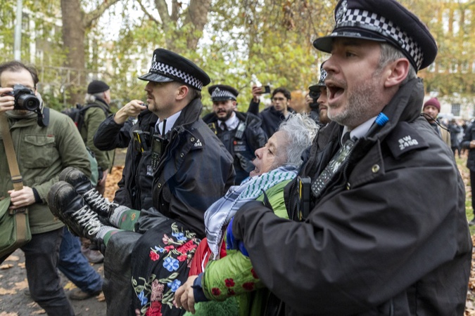 The Peace Garden, Tavistock Square, WC1H 9BQ — Saturday 22nd November 2025. Protesters gathered for the second London "Lift the Ban” event, opposing the government's ban on direct-action group Palestine Action. The demonstration formed part of the wider "Defend Our Juries” campaign. Police maintained a strong presence throughout the protest, during which approximately 100 people were arrested for terrorism offences., Credit:Abdullah Bailey / Avalon